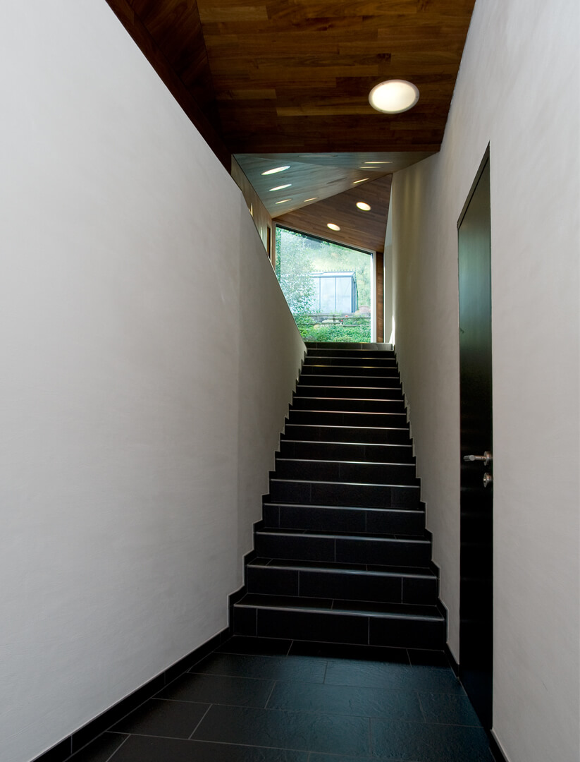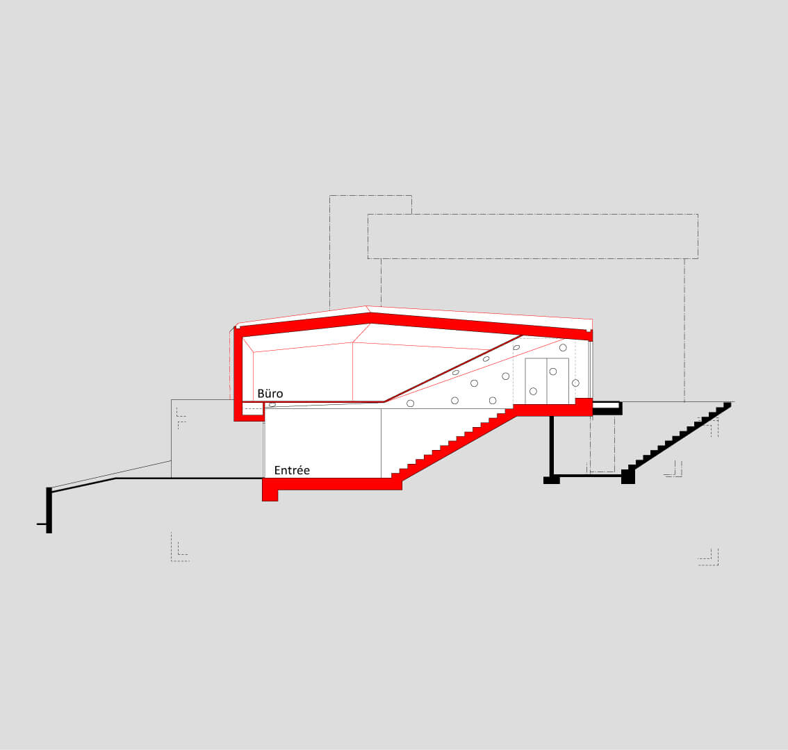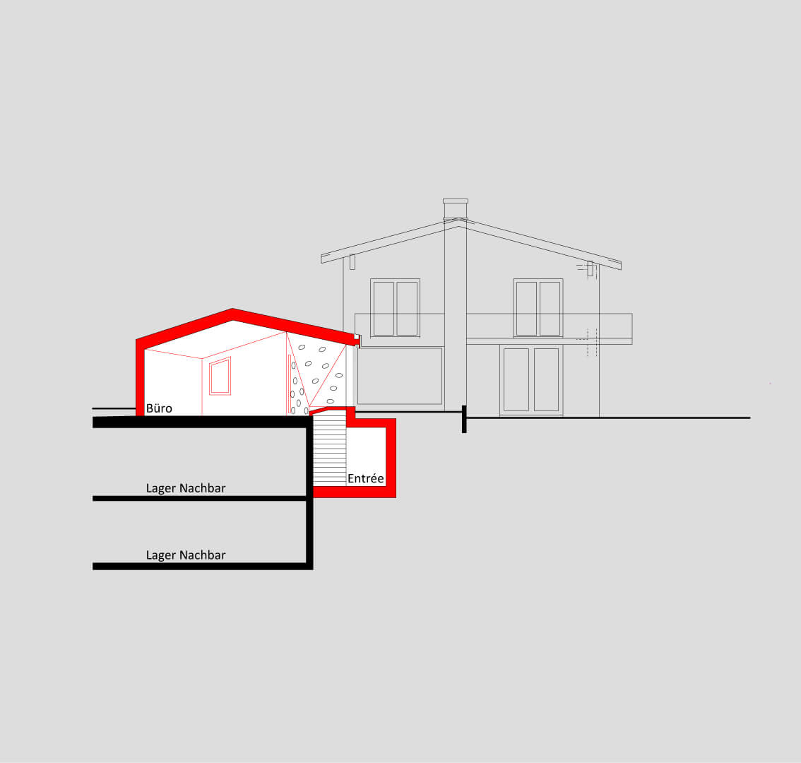 Das Einfamilienhaus aus den 60er Jahren liegt am Fuss eines steilen Hanges in Bettingen, musste umfassend renoviert und durch einen Büroanbau und neuem Hauseingang ergänzt werden. Da auf dem Grundstück vorgängig ein unterirdisches 2-geschossiges Lagergebäude für den Nachbarn realisierte wurde, konnte der Raum zwischen diesem und den alten Kellerwänden für den Hauseingang mit Treppe in das Wohngeschoss genutzt werden. Bedingt durch diese vorgegebene Situation mit entsprechenden Grenzabständen entstand auf der Decke des Lagergebäudes ein polygonaler eingeschossiger Anbau, dessen längliche Form auch Fenster nach Süden ermöglicht.