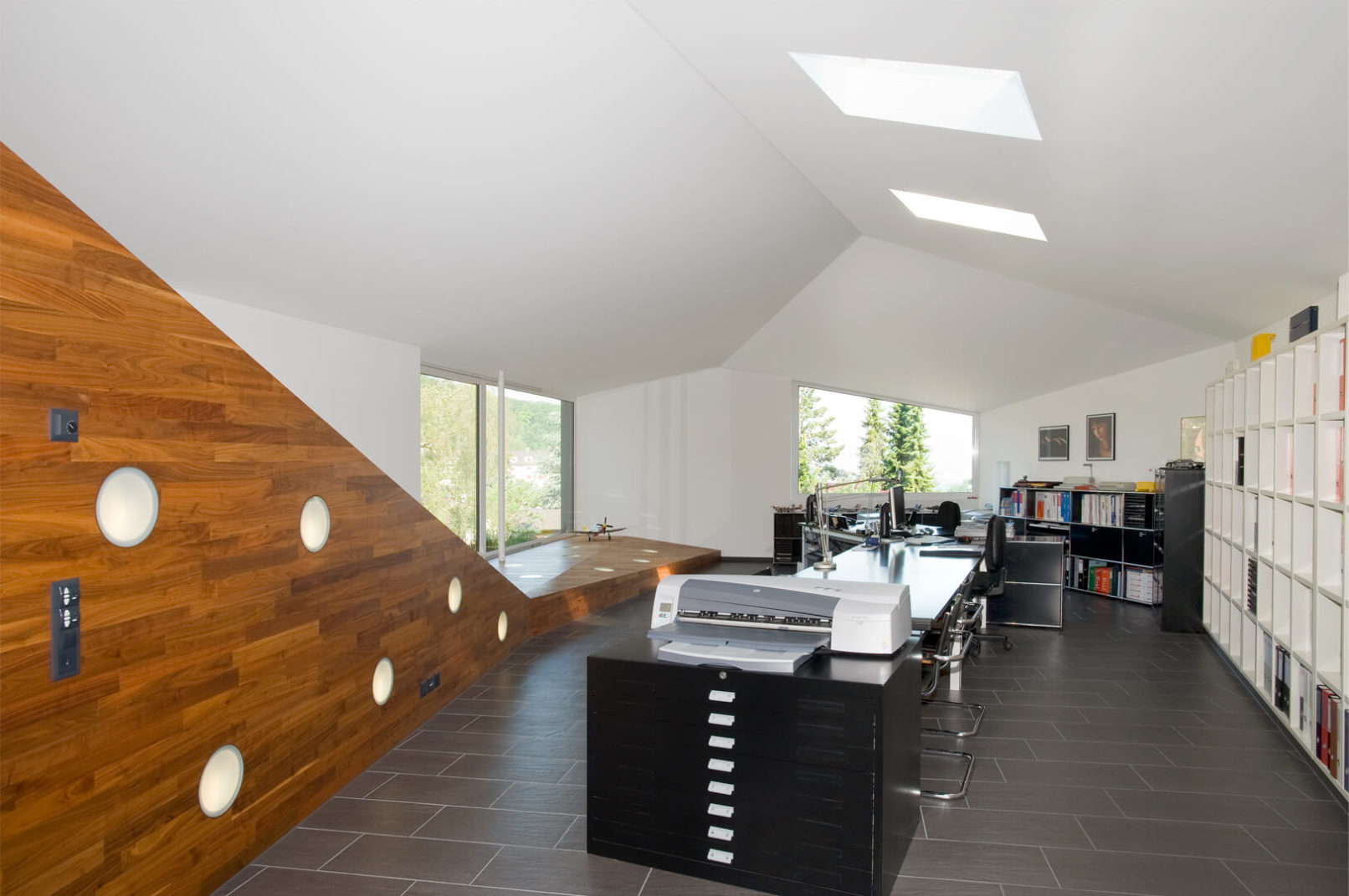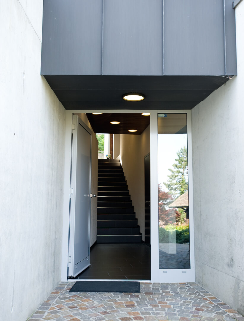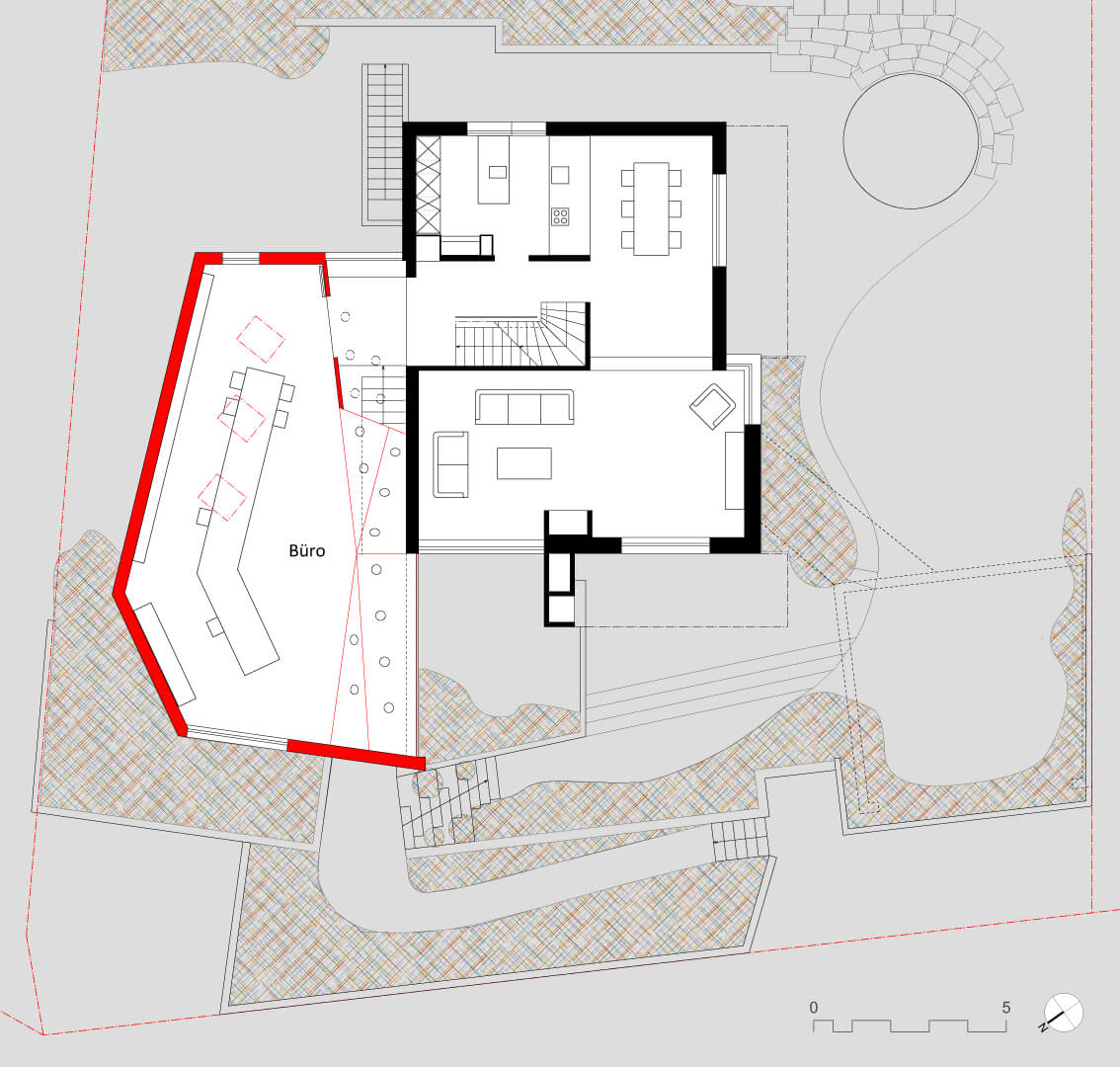 Das Einfamilienhaus aus den 60er Jahren liegt am Fuss eines steilen Hanges in Bettingen, musste umfassend renoviert und durch einen Büroanbau und neuem Hauseingang ergänzt werden. Da auf dem Grundstück vorgängig ein unterirdisches 2-geschossiges Lagergebäude für den Nachbarn realisierte wurde, konnte der Raum zwischen diesem und den alten Kellerwänden für den Hauseingang mit Treppe in das Wohngeschoss genutzt werden. Bedingt durch diese vorgegebene Situation mit entsprechenden Grenzabständen entstand auf der Decke des Lagergebäudes ein polygonaler eingeschossiger Anbau, dessen längliche Form auch Fenster nach Süden ermöglicht.