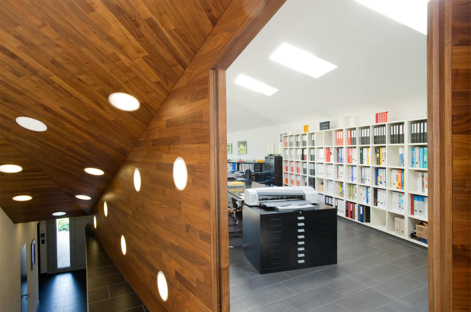 Die freie Form – eine gedämmte Stahlkonstruktion mit äusserer Verkleidung aus anthrazitfarbigem Titanzinkblech und inneren Gipsplattenverkleidung – ist auch im stützenfreien Innenraum spürbar und wird im Trennelement zwischen Eingangsbereich und Büro fortgesetzt. Diese Wand-Decke- Konstruktion aus Stahl, Holzplatten und Nussbaumparkett ist das gestaltungsbestimmende Element des Projektes. Dessen Einbaulampen sind von beiden Seiten erlebbar und zeichnen auch nachts die Form nach. Fotos: Mathias Leemann